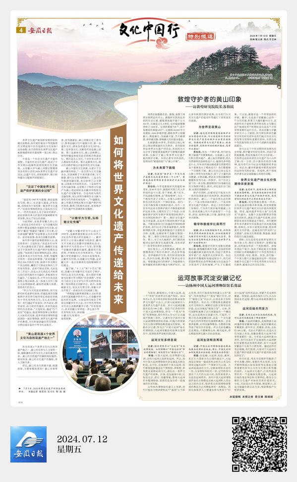 《如何将世界文化遗产传递给未来》《敦煌守护者的黄山印象——访敦煌研究院院长苏伯民》《运河故事沉淀安徽记忆——访扬州中国大运河博物馆馆长郑晶》三篇特别报道对遗产文化、系统性保护、展示和传播的主题展开深度探讨。