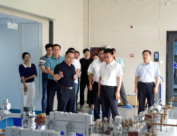 在磬苑校区,张洪彬一行首先来到强光磁科学中心,结合PPT演示听取“强光磁试验装置”及集成电路先进材料与技术研究设施等情况介绍,实地参观调研强光磁试验装置实验站。