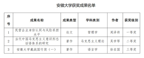 本网讯(人文社会科学处)近日,教育部正式公布了第九届高等学校科学研究优秀成果奖(人文社会科学)评选结果,安徽大学共有3项成果获奖,其中一等奖、二等奖、三等奖各1项。
