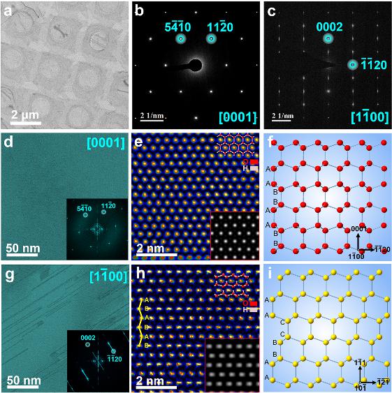 图 1.冰膜的结构表征。(a) 冰膜的低倍 TEM 像。(b、c)分别沿 [0001] 和 [1-100] 方向的电子衍射图。(d、g)冰的 [0001] 和 [1-100] TEM 像及相应的 FFT 插图。(e)[0001] HRTEM 像,右上角叠加了投影原子模型。右下角插入冰 Ih在 [0001] 方向上的模拟 HRTEM 像。(h) 冰的[1-100] HRTEM 像,右上角叠加了原子模型。右下角插入冰 Ih在[1-100]方向上的模拟 HRTEM 像。(f,i)冰 Ih沿[1-100]方向和 Ic沿[10-1]方向的投影结构模型。A、B 和 C 显示了具有一定位移的相应分子层。