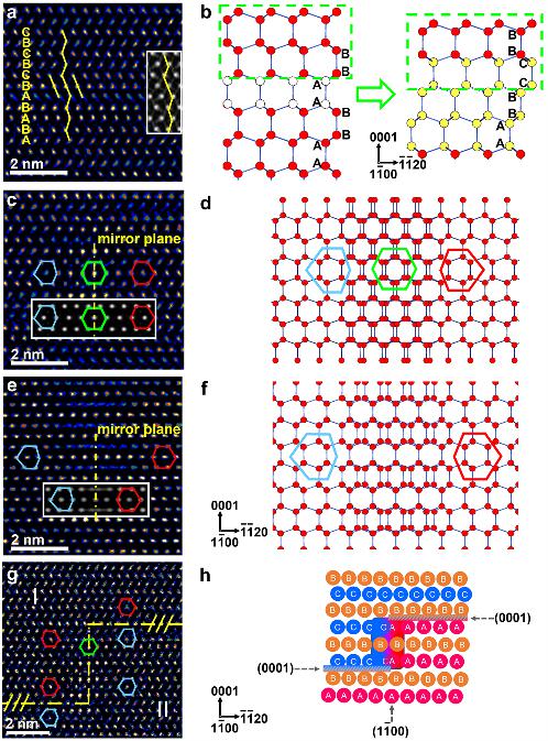 图 2.冰 Ih中的堆垛层错。(a、c、e、g)冰 Ih中沿[1-100]方向观察到堆垛层错的 HRTEM 像及对应的模拟像。(c)、(e)和(g)中的蓝色和红色扭曲六边形环显示了结晶良好区域的特征,绿色六边形显示了 PSF 缺陷区域的特征。(b、d、f)BSF、PSF 1 和 PSF 2 的投影结构模型,其中(b)中的黄色圆圈代表缺陷区域形成的冰Ic结构。(h) BSF 和 PSF 连接示意图。