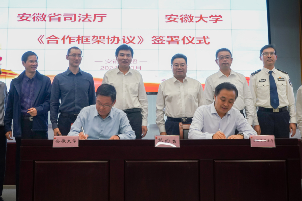 本网讯(融媒体中心 郑敏 周仲寅)10月11日下午,我校与安徽省司法厅合作框架协议签约仪式在安徽省司法厅二楼会议室举行。校党委书记虞宝桃,安徽省司法厅党委书记、厅长罗建华致辞并为“安徽法治研究院”揭牌。校党委常委、副校长周飞和安徽省司法厅党委委员、副厅长、一级巡视员张国安签署合作框架协议。安徽省监狱局党委副书记、政委梁国强,安徽省戒毒局党委书记、政委、二级巡视员何远国,安徽警官职业学院党委副书记、院长操申斌出席。仪式由张国安主持。