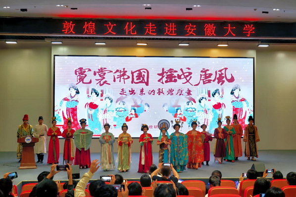 本网讯(融媒体中心 蔡丽丽 符玉娟)身着敦煌壁画服饰,在导师们的指导下,学生模特变身成为敦煌壁画里的人物,跨越时间之门,重回唐时敦煌!10月21日下午,“敦煌文化走进安徽大学”活动在磬苑校区材料科学大楼D座二楼报告厅举办。校党委常委、副校长陈城出席并致辞。学校有关单位负责同志和300多名师生参加活动。
