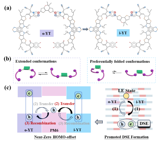 本网讯(物质科学与信息技术研究院)基于精准寡聚物受体(POA)的有机太阳能电池(OSCs)兼具高效率和优异的稳定性,是目前有机光伏领域的研究热点之一。值得注意的是,较之小分子受体,POA-OSCs的开路电压有明显提升。然而,其内在原因尚不明确。鉴于此,我校物质科学与信息技术研究院余志鹏副教授课题组与浙江大学李昌治教授、浙江大学科创中心刘志玺研究员、安徽师范大学陆洲教授合作,首次采用5,5-二辛基-5H-二噻吩并[3,2-b:2',3'-d]吡喃这一不对称基团作为连接体,设计并合成了两种二聚体受体o-YT和i-YT(图1)。不仅提高了受体的能级,同时,它还调控了受体分子的构象。i-YT展现了折叠体构象和拓展构象,而o-YT中仅存在两种拓展构象。瞬态吸收测试表明,在i-YT纯膜中,定域激子(LE)可以更有效地转化为离域激子(DSE)。因此,即使给、受体的能极差几乎为0,在PM6:i-YT共混膜中,激子在界面处同样可以高效地解离,同时复合速率也更慢。最终PM6:i-YT的器件获得0.93V的高开路电压和超过18%的光电转化效率。同时,器件稳定性也更加优异,在持续光照1400小时下,依然保持初始效率的85%。