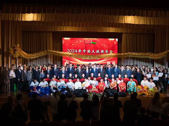 本网讯(布列斯特国立大学孔子学院 管先恒)当地时间11月12日,2024年度“中国大使奖学金”颁奖典礼在白俄罗斯国立体育大学举行。布大孔院学员可秀莎、叶卡捷琳娜、乌里杨娜和多米尼克荣获“中国大使奖学金”,下属教学点布列斯特市第二十八中学教师安娜获得“2024年优秀中文教师奖”,扎宾卡市第三中学获颁“2024年中文教学工作示范单位”荣誉称号。