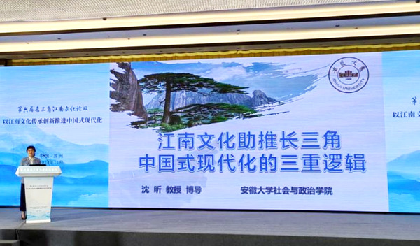 本网讯(宗禾)长三角三省一市社科联共同主办的第六届长三角江南文化论坛日前在苏州召开。论坛聚焦“以江南文化传承创新推进中国式现代化”,立足文化视角,开展研讨交流,为长三角高质量一体化发展和中国式现代化建设献智献策。我校社会与政治学院沈昕教授应邀作题为《江南文化助推长三角中国式现代化的三重逻辑》的主旨演讲。