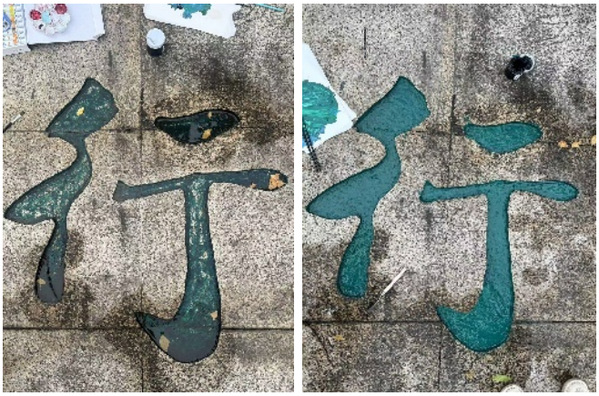镌刻于校园景观石上的书法是校园文化艺术的重要载体,其书法色彩因长期日晒雨淋,出现了不同程度的褪色脱落的现象。为恢复景观风貌,艺术学院美术系的师生们组成了修复团队,充分发挥专业优势,依据原有的色彩设计与文化内涵,对掉色脱落部分进行了细致的补色修复。