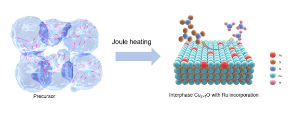 本网讯(物质科学与信息技术研究院)近年来,以焦耳热合成为代表的快速合成方法为新材料的制备和结构调控提供了新的研究视野,也为高熵合金、单原子材料、亚稳相材料等特殊结构的材料合成开辟了新路径。近日,我校研究人员成功利用焦耳热合成方法制备出了Cu2+1O纳米材料,并对其局域电子结构进行了有效调控。相关成果以“Optimizing Local Configuration of Interphase Copper Oxide by Ru Atoms Incorporation for High-Efficient Nitrate Reduction to Ammonia”为题在《Advanced Functional Materials》上在线发表(DOI:10.1002/adfm.202417486)。物质科学与信息技术研究院青年教师林运祥、硕士生汪莹、许颖为论文共同第一作者,杨丽老师、武传强老师和中国科学技术大学宋礼老师为论文共同通讯作者,安徽大学为第一单位。