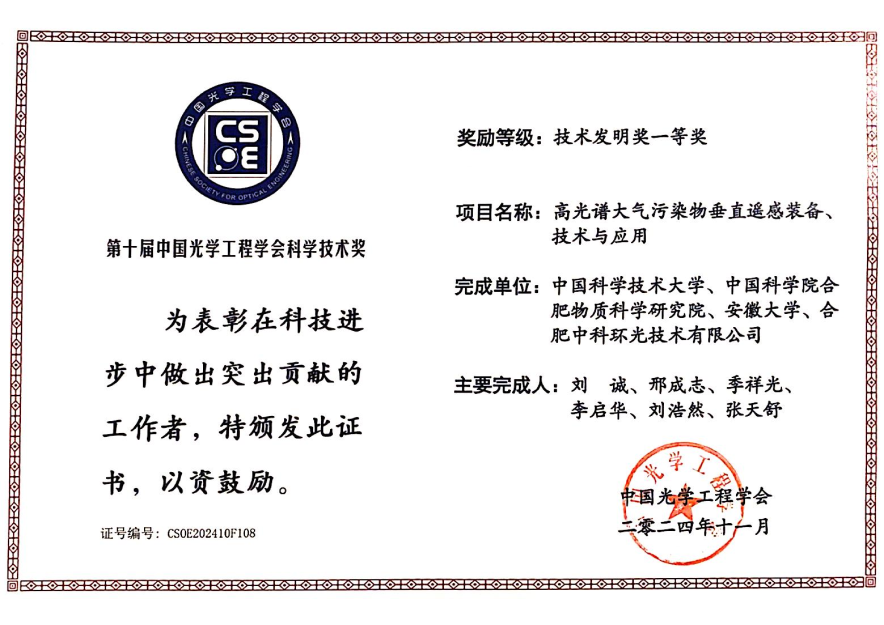 本网讯(物质科学与信息技术研究院)11月30日,第十届中国光学工程学会科学技术奖颁奖仪式在四川成都举行。由中国科学技术大学、中国科学院合肥物质科学研究院、安徽大学、合肥中科环光技术有限公司等单位参与的“高光谱大气污染物垂直遥感装备、技术与应用”项目,荣获技术发明奖一等奖。安徽大学物质科学与信息技术研究院环境物理与技术研究所李启华、刘浩然,信息材料与智能感知安徽省实验室季祥光为该项目的主要完成人。