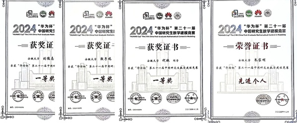 本网讯(互联网学院) 近日,2024年“华为杯”第二十一届中国研究生数学建模竞赛颁奖大会在山东大学举行。我校互联网学院研究生刘德志、代婉和殷子嫣组成的队伍荣获全国一等奖,指导老师朱家明获评“先进个人”,学校被评为“优秀组织单位”。此外有17支队伍获二等奖、17支队伍获三等奖。