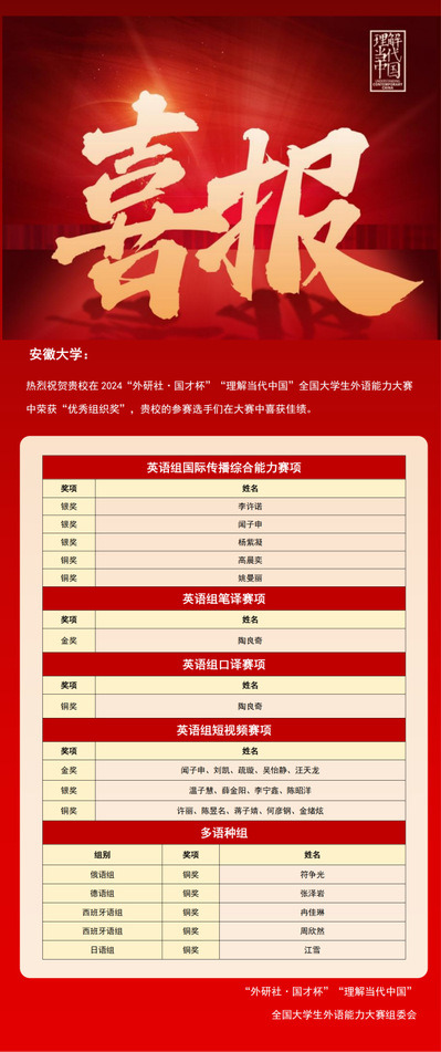 本网讯(外语学院 王张)近日,2024“外研社·国才杯”“理解当代中国”全国大学生外语能力大赛全国总决赛在北京外国语大学落下帷幕。经激烈角逐,我校学子获金奖2项、银奖4项、铜奖9项,学校获“优秀组织奖”。
