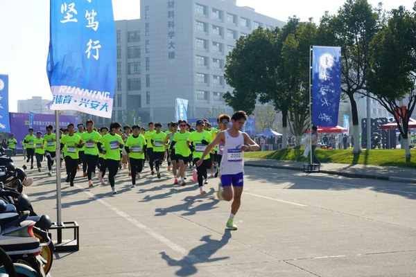下午两点,比赛正式拉开序幕。校领导和相关职能部门负责人领跑,运动员相继冲出起跑线,从磬苑校区南门启程,绕校区主干道,途经东、西门后折返,最终朝着南门冲刺。赛道沿途的各个转角,都有专业裁判员与志愿者严阵以待,醒目的指示牌为后续选手指引方向,全方位确保比赛有条不紊地推进。