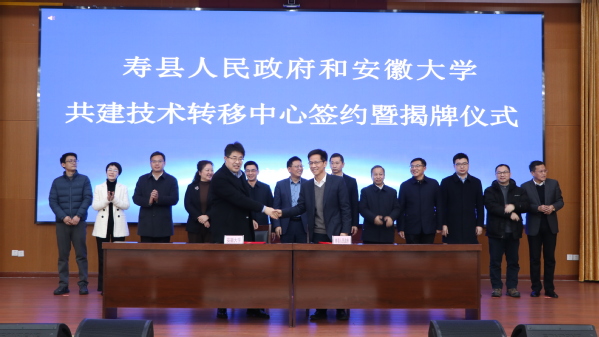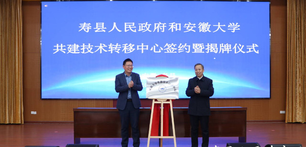 会上,王守国和牛方括共同为“安徽大学寿县技术转移中心”揭牌。寿县县委常委、副县长余向荣与安徽大学科学技术处处长郑春厚签署协议。