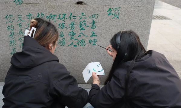 补色当天,同学们带着调配好的颜料去到相应的景观石前,先用刮刀去除景观石刻字里的污渍和松动的旧漆层,进行小规模试色,在确定颜色协调后对石块上的笔画进行均匀补色。