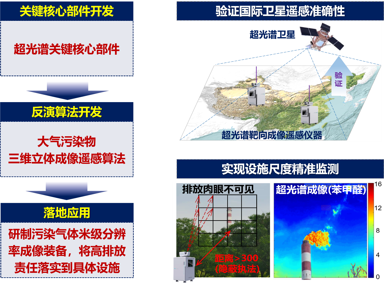为此,本项目研究团队在国家重点研发计划、国家自然科学基金重大研究计划等项目支持下,研制了一款超光谱分辨率、高信噪比、狭缝函数稳定的超分辨光谱仪;研制了高光程体积比的多通道光学极弱吸收性气体吸收截面检测装置,实现了对醛类、酮类、酯类和苯系物等吸收信号极弱的多种VOCs特征“指纹”吸收信号的精确探测;研发了超光谱解析融合人工智能的靶向成像遥感算法,解决了羽流内极复杂光子路径精准刻画的难题,实现了排放羽流米级分辨率成像观测,将污染排放责任从公里级网格细化到具体施级尺度。团队通过一系列关键部件和技术突破,使超光谱靶向成像装备同时实现了污染源靶向成像、多组分气体水平与垂直成像功能,推动了我国自主可控的大气环境超光谱立体遥感技术创新,为我国“降碳减污”工作提供了必不可少的新技术和新装备支撑。