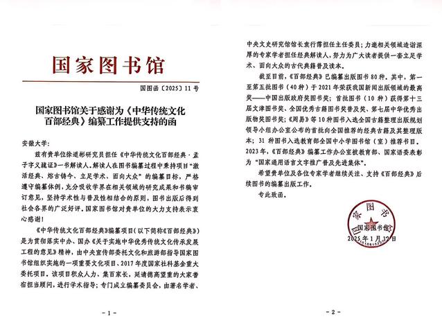 本网讯(人文社会科学处 操礼和)近日,国家图书馆专门致函我校,向徽学研究中心徐道彬研究员大力支持《中华传统文化百部经典》编纂工作表达谢意。