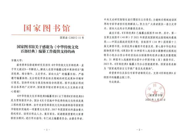 本网讯(人文社会科学处 操礼和)近日,国家图书馆致函我校,向徽学研究中心徐道彬研究员大力支持《中华传统文化百部经典》编纂工作表达谢意。