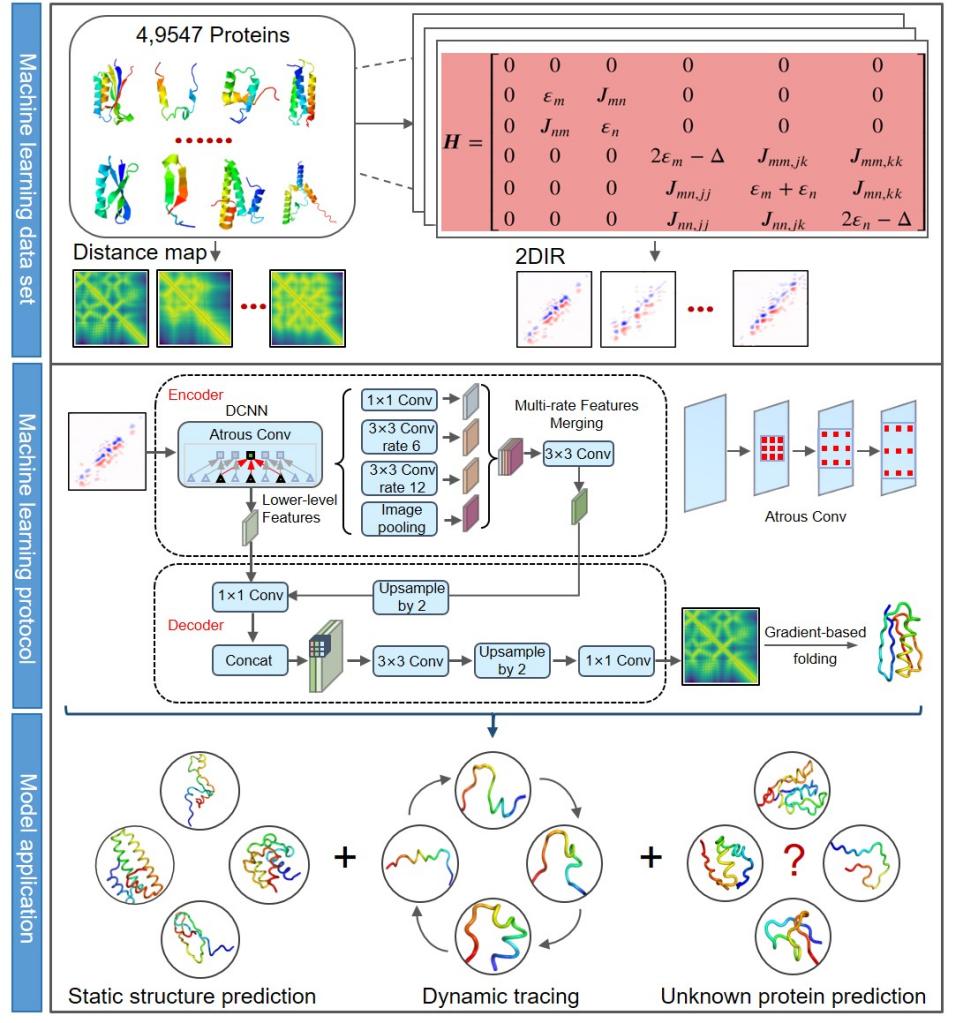 蛋白质动态过程中的结构演化是其发挥生物功能的关键,然而动态变化过程往往涉及到不同的空间和时间尺度,这给蛋白质动态过程中的结构探测带来了巨大挑战。如何能够实时探测蛋白质在动态变化过程中的结构信息,并建立起蛋白质分子精准的构效关系,成为蛋白质结构研究领域亟待解决的核心问题。二维红外光谱(2DIR)技术被广泛运用于探测从飞秒到微秒时间尺度下蛋白质结构演化的超快动力学过程,然而如何精确解读这些复杂低维的光谱信号并反演成高维的三维分子结构信息,长期以来一直是分子光谱领域亟待解决的重大难题。这不仅极大地阻碍了实验光谱数据的精确解读,也严重限制了分子光谱技术在蛋白质动态结构探测方面的广泛应用。