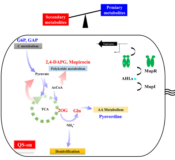 群体感应是细菌通过化学信号分子感知群体密度并调节基因表达的机制。细菌通过生成和响应自诱导信号分子来协调诸如抗生素生成、铁获取和生物膜形成等重要行为,这一机制对于细菌的生态适应性、群落动态及入侵机制至关重要。尽管群体感应在细菌的生物行为中扮演着关键角色,细菌的代谢和群体感应之间的关系仍不完全明确,特别如何通过群体感应信号来平衡“公共物品”(群体共享的代谢产物)与“私人物品”(个体所需的代谢物)的生产,这仍然是一个未解的问题。本研究以应用于农业的植物促生菌荧光假单胞菌Pseudomonas fluorescens 2P24为模型,探讨了群体感应在细菌代谢网络中的作用,尤其是在资源受限或高密度环境下如何优化“公共物品”(如聚酮类抗生素和铁载体)与“私人物品”(如供能代谢物)的生产。研究发现,细菌通过群体感应信号分子的感知和响应,调控碳和氮代谢路径,平衡“公共物品”和“私人物品”的生产。这种机制帮助细菌在资源受限或高密度环境中提高生存适应性。通过转录组学、代谢组学和ChIP-seq等技术手段,研究进一步揭示了群体感应系统如何精细调控代谢网络中的关键节点。群体感应通过转录因子MupR来调节细菌的代谢通量分布,影响碳代谢途径(如三羧酸循环)和氮代谢路径,确保聚酮类抗生素与铁载体的协同生产。在资源有限时,群体感应通过限制呼吸链活性和能量密集型代谢途径,重新分配代谢资源以平衡生长和“公共物品”的生产。当群体感应系统缺失时,荧光假单胞菌会显示出更强的铁载体合成能力,而聚酮类抗生素的合成则被抑制。这表明,细菌在环境条件变化时灵活调整代谢策略,以适应生存压力,这种灵活的代谢调整机制对于细菌在复杂环境中的生存至关重要。