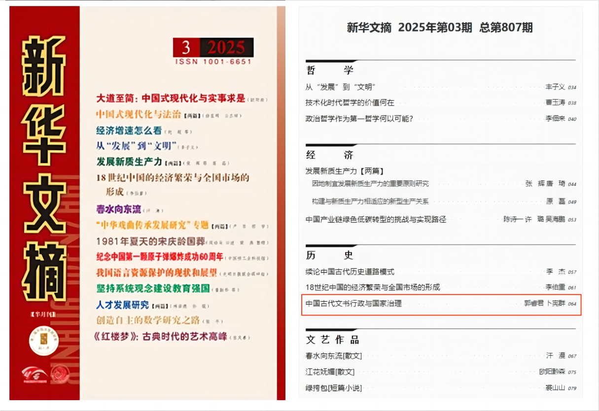 本网讯(人文社会科学处)近日,我校徽学研究中心郭睿君副研究员最新研究成果《中国古代文书行政与国家治理》(原刊《光明日报》史学理论版, 2024 年 11 月 18 日)被《新华文摘》2025年第3期全文转载。