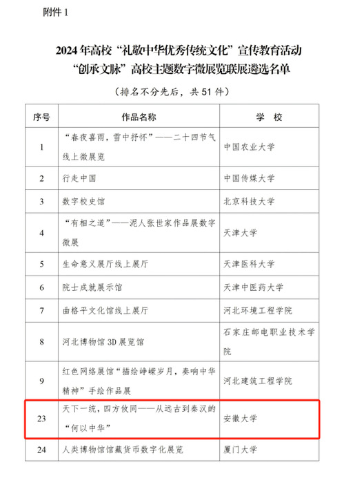 本网讯(融媒体中心)近日,教育部公布了2024年高校“礼敬中华优秀传统文化”宣传教育活动结果,我校历史学院报送的《天下一统,四方攸同——从远古到秦汉的“何以中华”》案例成功入选“创承文脉”高校主题数字微展览联展遴选名单。