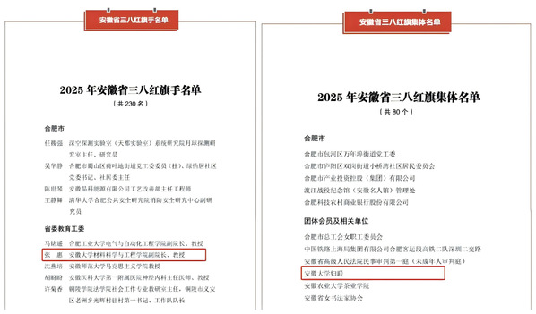 本网讯(融媒体中心)为表彰先进、树立榜样,激励广大妇女自尊自信、自立自强,奋进新征程、建功新时代,在第115个国际劳动妇女节到来之际,省妇联召开表彰大会,集中表彰安徽省三八红旗集体等一批先进典型,我校材料科学与工程学院副院长、教授张惠获得“安徽省三八红旗手”荣誉称号,安徽大学妇联获得“安徽省三八红旗集体”荣誉称号。
