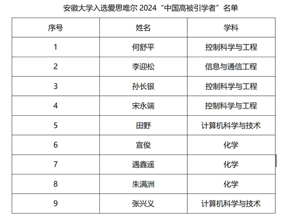 本次上榜共计6388人, 来自547所高校、企业及科研机构,覆盖了10个教育部学科领域中的83门一级学科。我校何舒平、李迎松、孙长银、宋永端、田野、宣俊、遇鑫遥、朱满洲、张兴义(按姓名英文字母顺序排序)共9人入选该榜单,入选人数位列安徽省属高校第一。