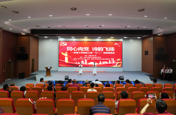 本网讯(融媒体中心)为庆祝中国共产党成立104周年,7月1日下午,安徽大学“同心向党 诗韵飞扬”教职工迎“七一”诗歌朗诵会在磬苑校区材料科学大楼报告厅举办。校党委书记虞宝桃出席活动。本次活动由安徽大学工会主办、安徽大学教职工朗诵艺术学会承办。
