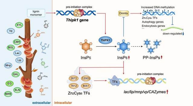 白腐真菌是自然界中极少数能够高效分解木质纤维素复合物的生物类群。它们通过分泌锰过氧化物酶、漆酶、木质素过氧化物酶等多种胞外木质素降解酶,有效破坏木质素的芳香族结构,从而释放被包裹在细胞壁基质中的纤维素和半纤维素。本研究发现肌醇五-磷酸2-激酶ThIPK1是白腐真菌响应木质素信号的核心因子,参与感应木质素信号,并进一步调节胞内信号通路,而5mC甲基化修饰与多个Zn2Cys6型转录因子则作为关键的下游效应元件,控制下游降解酶的差异表达,从而实现木质素的高效降解。该发现不仅为阐释森林碳循环中的微生物调控机制奠定了理论基础,也为进一步的木质素降解和增值提供了潜在策略。