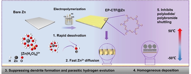 本网讯(物质科学与信息技术研究院)水性锌溴/碘电池因其高能量密度、固有的安全优势和潜在的成本效益而成为电网规模储能的有前途的候选者。然而,它们的实际应用受到锌阳极问题的阻碍,例如枝晶形成和寄生析氢反应(HER),以及多卤化物穿梭导致锌负极腐蚀。基于此,我校物质科学与信息技术研究院张朝峰教授团队与合作者报道了一种原位电聚合共价三嗪骨架(EP-CTF),它同时稳定了锌阳极并抑制了多卤化物的迁移,从而提高电池长期运行的循环性能和容量保持。
