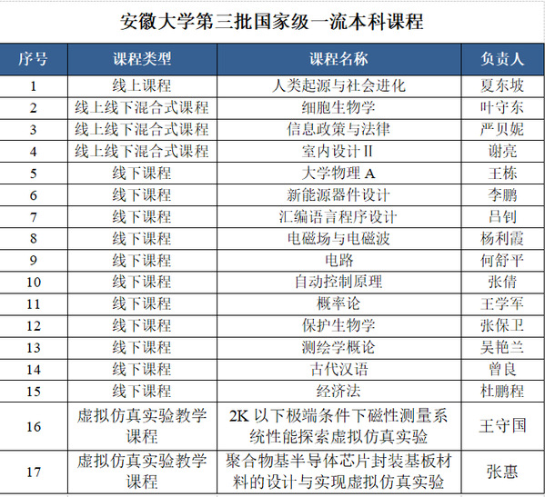 本网讯(教务处 融媒体中心)近日,教育部高等教育司公布第三批国家级一流本科课程认定结果,安徽大学共有17门课程成功入选第三批国家级一流本科课程,其中线上课程1门,线上线下混合式课程3门,线下课程11门,虚拟仿真实验教学课程2门。