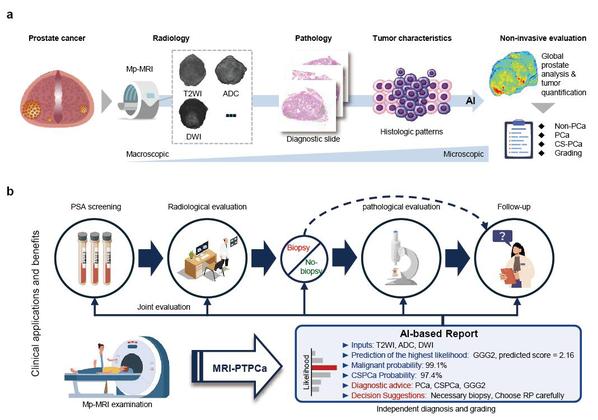 前列腺癌是男性常见的致病原因之一,也是导致死亡的主要原因。目前,临床缺乏有效的预测工具来在根治性手术前准确预测前列腺肿瘤的侵袭性,因此临床面临过度诊断与漏诊的挑战。研究团队创新性地提出了前列腺癌影像-病理基础模型,探索了前列腺癌磁共振影像与肿瘤病理学表征之间的定量映射关系,并构建了一个端到端的无创诊断和分级预测模型。该模型在国内外合计5000余例患者上进行了回顾性+前瞻性地测试,性能显著优于现有的临床评估方法。前列腺癌良恶性无创诊断曲线下面积(Area under the curve, AUC)达到0.983(95%置信区间:0.98-0.986),临床显著前列腺癌无创诊断的AUC达0.978(95%置信区间:0.975-0.98),无创分级准确率为89.1%(95%置信区间:88.2%-89.9%)。研究结果证明了人工智能实现了影像“等效”病理的可行性。该研究也为人工智能赋能精准医学与临床转化提供了更高等级的证据和信心。