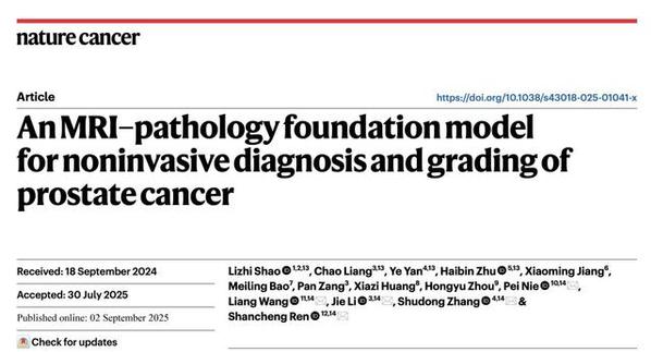 本网讯(互联网学院 科学技术处)近日,我校互联网学院邵立智老师与北京大学第三医院、南京医科大学第一附属医院、北京友谊医院、青岛大学附属医院和上海长征医院等多个国内知名医学中心展开医工合作,以前列腺癌无创诊断这一关键临床问题为导向,针对专病需求提出了影像病理关联表征学习方法和“影像-病理”基础模型。相较于现有临床检查手段,在真实世界临床测试中以无创的方式实现了多中心、多地区、多人种的精准前列腺癌诊断与分级。相关研究成果以“An MRI-Pathology Foundation Model for Non-Invasive Diagnosis and Grading of Prostate Cancer”为题,在线发表于国际顶级期刊《Nature Cancer》(SCI IF=28.50)。我校邵立智老师为第一作者,安徽大学为第一单位。这是半个月内我校在Nature大子刊发表的第二篇成果。该工作是我校在“人工智能+医学”研究领域的显著进展,是学校“双一流”建设的重要成果。