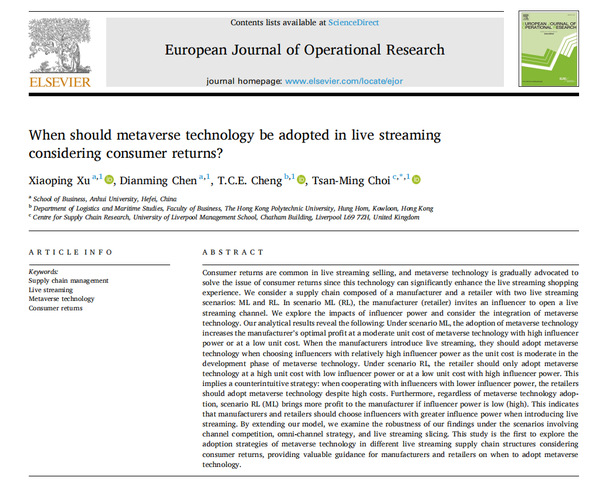 本网讯(商学院)近日,商学院徐小平教授团队围绕平台化运作研究在运筹学领域国际核心期刊《European Journal of Operational Research》上发表题为“When Should Metaverse Technology be Adopted in Live Streaming Considering Consumer Returns?”学术论文。