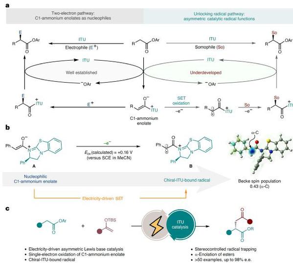 羧酸酯作为一类重要结构单元广泛存在于生物、化学与材料科学领域,其不对称α-官能团化反应在有机合成中具有关键意义。本研究创新性地将手性异硫脲路易斯碱催化与电化学合成相结合,开发了一种新型催化策略:手性异硫脲催化剂与羧酸酯反应生成的C1-烯醇铵盐中间体,通过电化学单电子氧化生成手性异硫脲结合的α-羰基自由基物种,成功实现了与硅烯醇醚的不对称氧化自由基交叉偶联反应(图2)。该策略在在温和条件下高效合成了一系列底物范围宽泛的1,4-二羰基化合物,获得优异的产率和对映选择性(最高达98% e.e.)。机理研究证实,C1-烯醇铵盐中间体的低氧化电位特性有效抑制了外消旋背景反应,同时异硫脲催化剂形成的手性空腔通过对共价键合自由基中间体的立体控制,确保了自由基反应过程的高对映选择性。本研究突破了传统双电子反应模式的限制,将手性异硫脲催化从离子型反应拓展到自由基反应领域,为开发多样化立体可控自由基反应提供了新范式,显著推动了不对称电合成领域的发展。