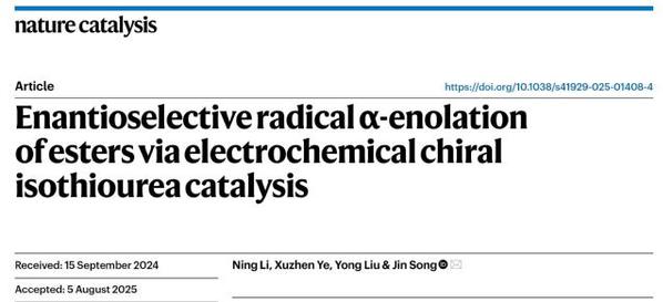 本网讯(物质科学与信息技术研究院)近日,我校物质科学与信息技术研究院宋琎教授课题组开发了一种电化学驱动手性路易斯碱催化新策略。该研究通过手性异硫脲催化实现电化学氧化与共价结合自由基中间体的立体化学控制作用,高效合成了多种1,4-二羰基化合物(图1)。相关工作以“Enantioselective radical α-enolation of esters via electrochemical chiral isothiourea catalysis”为题在国际顶级期刊《Nature Catalysis》(SCI IF = 44.6)上在线发表(DOI:10.1038/s41929-025-01408-4)。我校2022级硕士研究生李宁为论文第一作者,宋琎教授为通讯作者,安徽大学为唯一通讯单位。该工作是我校在“电化学合成”研究领域的显著进展。