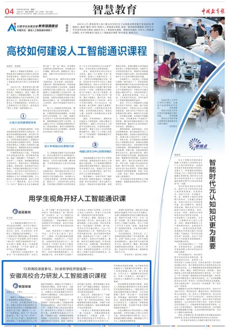 本网讯(融媒体中心)9月23日,《中国教育报》第4版智慧教育栏目刊发文章《13所高校深度参与、30余所学校开放选用——安徽高校合力研发人工智能通识课程》,报道了我校牵头研发全省人工智能通识课程。