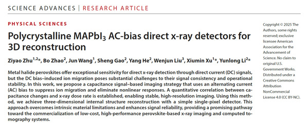 本网讯(集成电路学院)近日,我校集成电路学院朱子尧老师、徐秀敏老师与中国科学院深圳先进技术研究院李云龙副研究员团队开展合作,揭示了一种基于高离子浓度软晶格半导体电容信号的新型X射线探测机理,并基于此实现了X射线成像与三维结构重构。相关成果以“Polycrystalline MAPbI₃ AC-bias Direct X-ray Detectors for 3D Reconstruction”(DOI: 10.1126/sciadv.adx8785)为题发表于国际顶级期刊《Science Advances》(SCI,IF=12.5)。我校集成电路学院朱子尧老师为第一作者兼通讯作者,我校集成电路学院徐秀敏老师和中国科学院深圳先进技术研究院李云龙副研究员为共同通讯作者,安徽大学为第一单位。该工作是我校在“集成电路科学与工程”学科研究领域取得的显著进展之一。