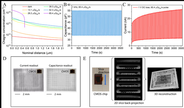 图2. (A)金属卤化物钙钛矿界面结;X射线辐照电容信号(B)与电流信号(C)对比;(D)X射线二维成像对比;(E)基于电容信号的三维结构重构验证