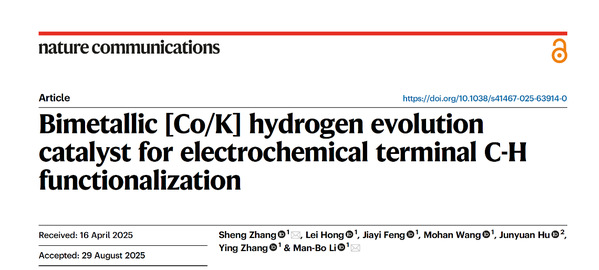本网讯(材料科学与工程学部)近日,我校材料科学与工程学部李漫波教授与张胜副教授团队,在电催化合成领域取得重要进展。他们开发出一种钴/钾双金属析氢催化策略,成功实现了烯烃衍生物末端C-H键的精准官能化。相关研究成果以“Bimetallic [Co/K] hydrogen evolution catalyst for electrochemical terminal C-H functionalization”为题在国际顶级期刊《Nature Communications》上在线发表(DOI: 10.1038/s41467-025-63914-0)。安徽大学张胜副教授为第一作者及通讯作者,李漫波教授为共同通讯作者,安徽大学为第一通讯单位。该工作是我校在“电催化合成”研究领域的显著进展之一。