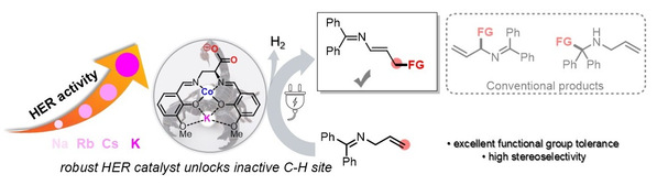 析氢反应是能源化学领域中的关键过程,开发高效析氢催化剂对于推动其实际应用具有重要意义。同时,高性能析氢催化剂的发展也为有机分子中C–H键的还原断裂提供了新策略,有助于促进新型有机转化反应的开发。受天然氢化酶结构的启发,研究团队将过渡金属钴与碱金属相结合,通过原位生成高活性金属氢物种,显著提升了析氢反应的催化效率。研究发现,碱金属的离子半径及其金属性对催化活性具有决定性影响,其中钴/钾双金属催化剂表现出最优的催化性能。该催化体系能够高效逆转烯烃衍生物的反应位点,实现其末端C–H键的高立体选择性氨甲基化,这一转化过程在传统方法中难以实现。该方法为多种手性胺类化合物及相关手性吡咯啉结构的高效构建提供了新途径,并展现出可克级规模放大、优异的区域选择性和化学选择性等突出优势。本研究在能源化学与合成化学之间架起了桥梁,为发展新型电催化模式提供了新思路。