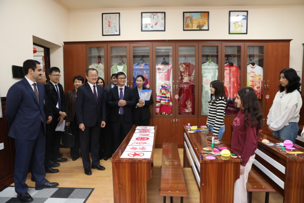随后,代表团一行抵达我校巴库国立大学孔子学院。热情的阿塞拜疆舞蹈和激荡的传统乐器表达着对代表团的期盼与欢迎。杜江峰副部长在参观孔子学院的过程中关心询问着孔子学院教学、考试和活动情况,并与正在进行的剪纸手工课上的学生进行了亲切的交谈。在孔子学院会议室,杜江峰副部长会见了优秀学生代表,详细地了解了他们的学习和工作情况,勉励他们继续提高汉语水平,做好中阿友谊的桥梁。