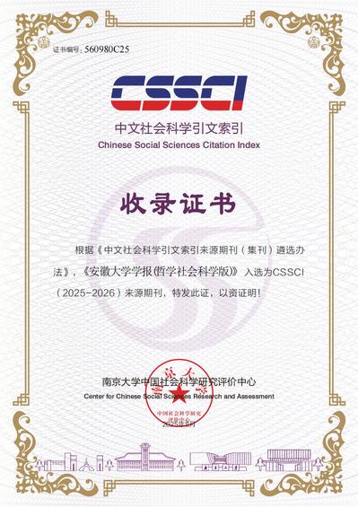 本网讯(学报编辑部)近日,南京大学中国社会科学研究评价中心更新了“中文社会科学引文索引”(Chinese Social Sciences Citation Index,缩写为CSSCI)数据库来源期刊,《安徽大学学报(哲学社会科学版)》继续入选CSSCI(2025-2026)来源期刊,证书编号560980C25。