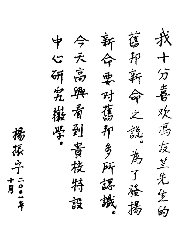 早在2001年10月25日,杨振宁先生曾到访安徽大学,在时任校党委书记孙献忠、校长黄德宽的陪同下参观学校,并为我校徽学研究中心题词:我十分喜欢冯友兰先生的旧邦新命之说。为了发扬新命要对旧邦多所认识。今天高兴看到贵校特设中心研究徽学。当天,杨振宁先生在龙河校区大礼堂作《谈谈我近来的观感》主题报告。现任新闻传播学院副院长章玉政老师当时参与杨先生的采访工作,多年以后想起来依然记忆犹新。章玉政说:“当时,我刚从安徽大学新闻系毕业不久,在省内一家都市报当记者,全程参与杨先生回皖期间的采访工作。我记得他到安徽大学访问,给徽学研究中心题词,提到冯友兰先生的‘旧邦新命’说,肯定安大特设中心研究徽学。他在龙河校区大礼堂演讲的时候,深情回忆起小时候在合肥的生活经历,还‘秀’了几句合肥话,很是可爱,有一种游子归来的松弛感。”