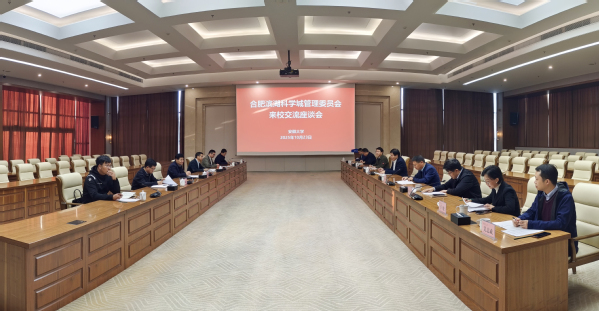 本网讯(融媒体中心)10月23日下午,合肥滨湖科学城管理委员会党工委委员、管委会常务副主任吴爱国,党工委委员、管委会副主任张生一行来校调研。校党委书记虞宝桃主持召开交流座谈会,校党委常委、副校长王守国出席。