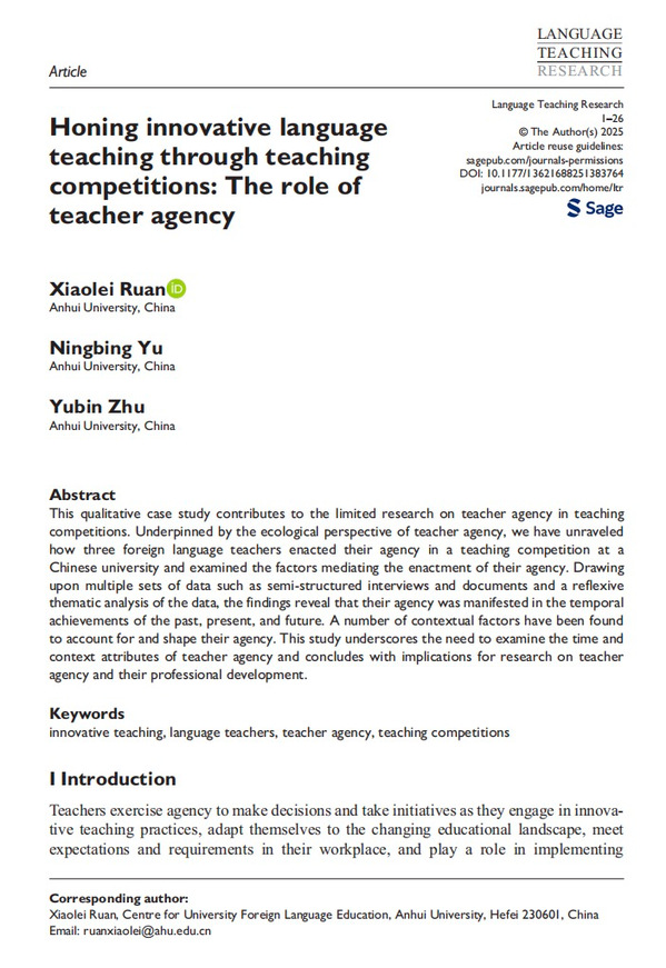 本网讯(大学外语教学中心)近日,我校大学外语教学中心阮晓蕾副教授、余凝冰教授、朱玉彬教授在国际期刊Language Teaching Research(《语言教学研究》)发表题为Honing innovative language teaching through teaching competitions: The role of teacher agency(《在教学竞赛中磨练语言教学创新:教师能动性的作用》)的论文(https://doi.org/10.1177/13621688251383764)。阮晓蕾副教授为本文的第一作者及通讯作者。