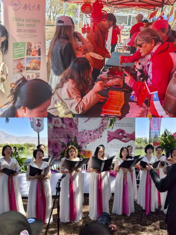 圣大孔院在活动现场精心组织了丰富的文化体验项目,包括舞狮表演、书法展示和品尝粽子等。同时,智利华人华侨妇女协会还带来了合唱《如愿》、《青春舞曲》、安塞腰鼓和藏族舞表演,让观众在动静交替中感受中国文化的深厚底蕴与独特魅力。