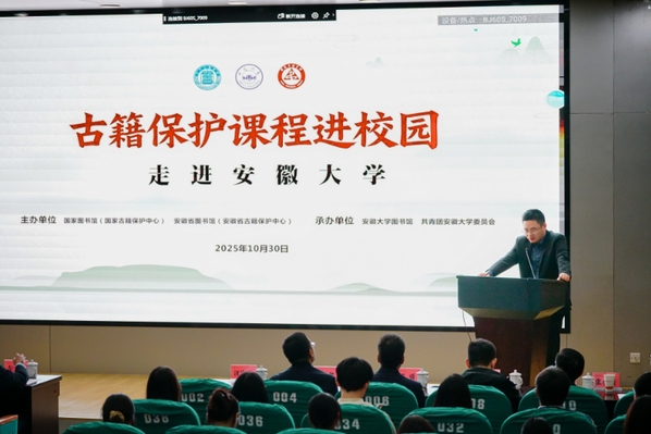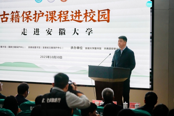 本网讯(图书馆)10 月 30 日,由国家图书馆(国家古籍保护中心)、安徽省图书馆(安徽省古籍保护中心)联合主办的“古籍保护课程进校园”活动在安徽大学龙河校区逸夫图书馆精彩呈现。这场集学术深度与体验趣味于一体的文化活动,在安徽大学图书馆的精心组织下为师生搭建了触摸古籍脉络、感受传统魅力的优质平台,让中华优秀传统文化在互动中焕发新生。