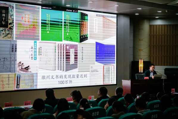暨南大学文学院历史系副教授黄忠鑫博士带来了主题为“徽州文书中的明清户籍与地籍”的精彩分享。他围绕户帖、黄册等户籍文书及鱼鳞图册等地籍文献,结合自身研究成果与生动案例,细致解读了这些珍贵古籍的形制特点与历史价值——从文书中记载的土地字号分配,到清代图甲户籍的运作细节,他用通俗的语言还原了明清时期国家典章制度在地域社会的落地实态,带领在场师生透过泛黄纸页触摸历史温度,深刻感悟古籍作为“活态历史档案”的文化分量。