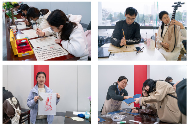 逸夫图书馆大厅的展示与体验区热闹非凡,活动设置了线装书装订、活字印刷、雕版印刷、拓印、专属馆藏字帖临抄、漆扇制作等传统工艺体验项目,还特别加入了我校学生带来的甲骨文书签DIY、甲骨文飞行棋、古籍函套制作、传统香囊制作等特色活动。现场还同步开展琵琶演奏、书画作品展示及投壶游戏,丝竹之声与墨香交织,传统雅趣与青春活力相融,将活动氛围推向高潮。